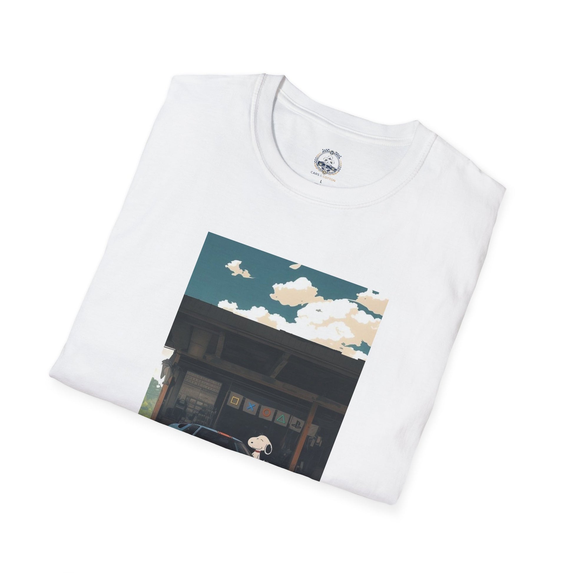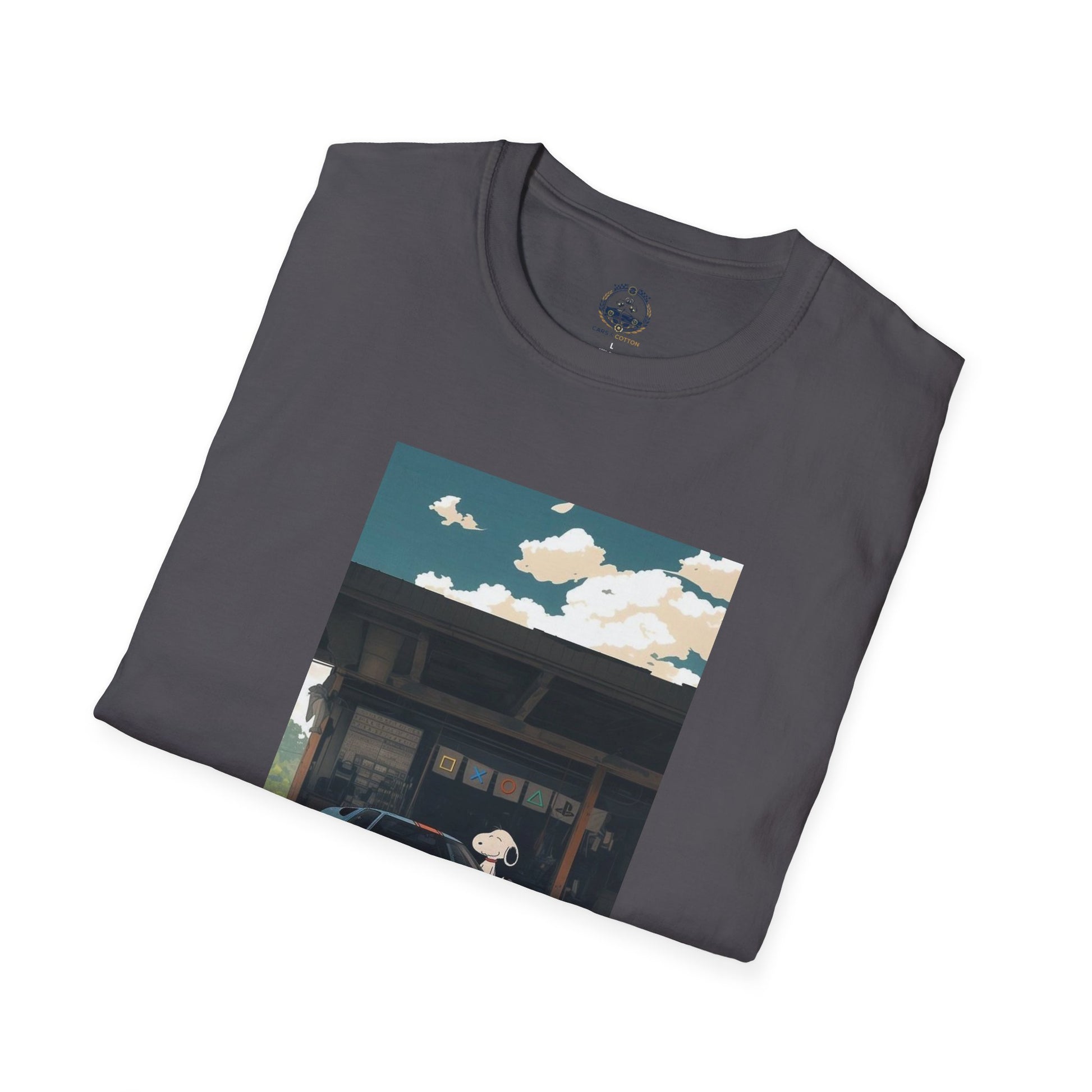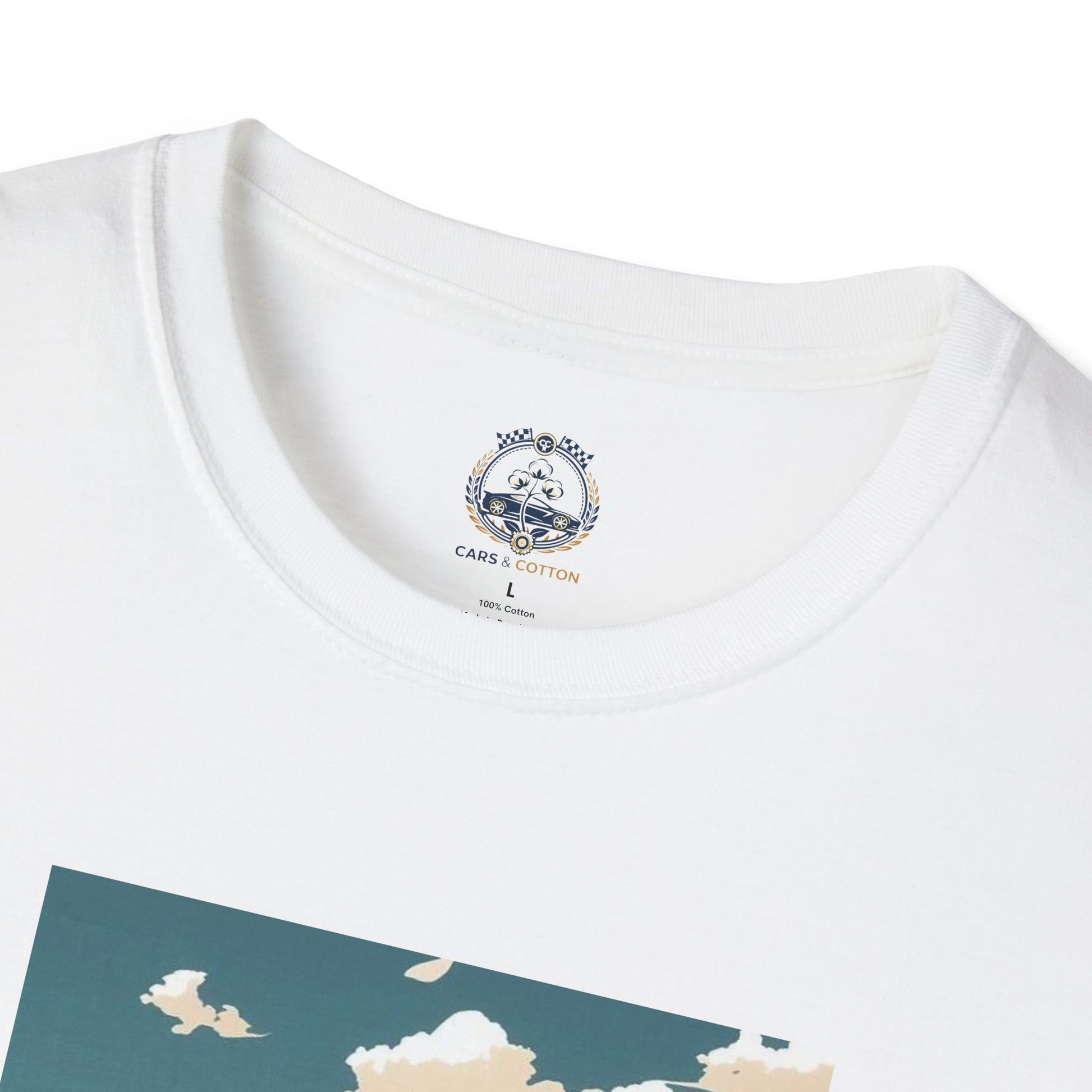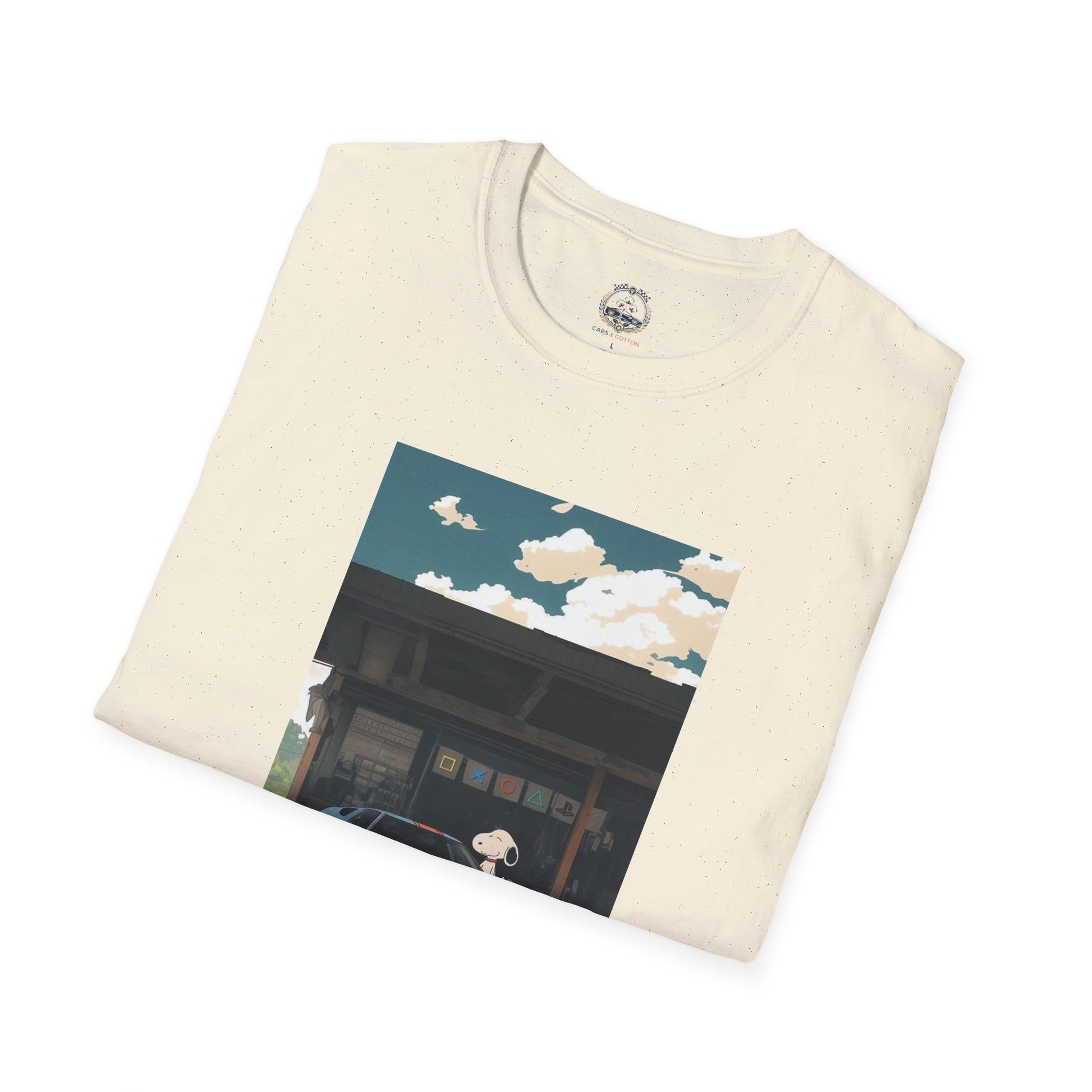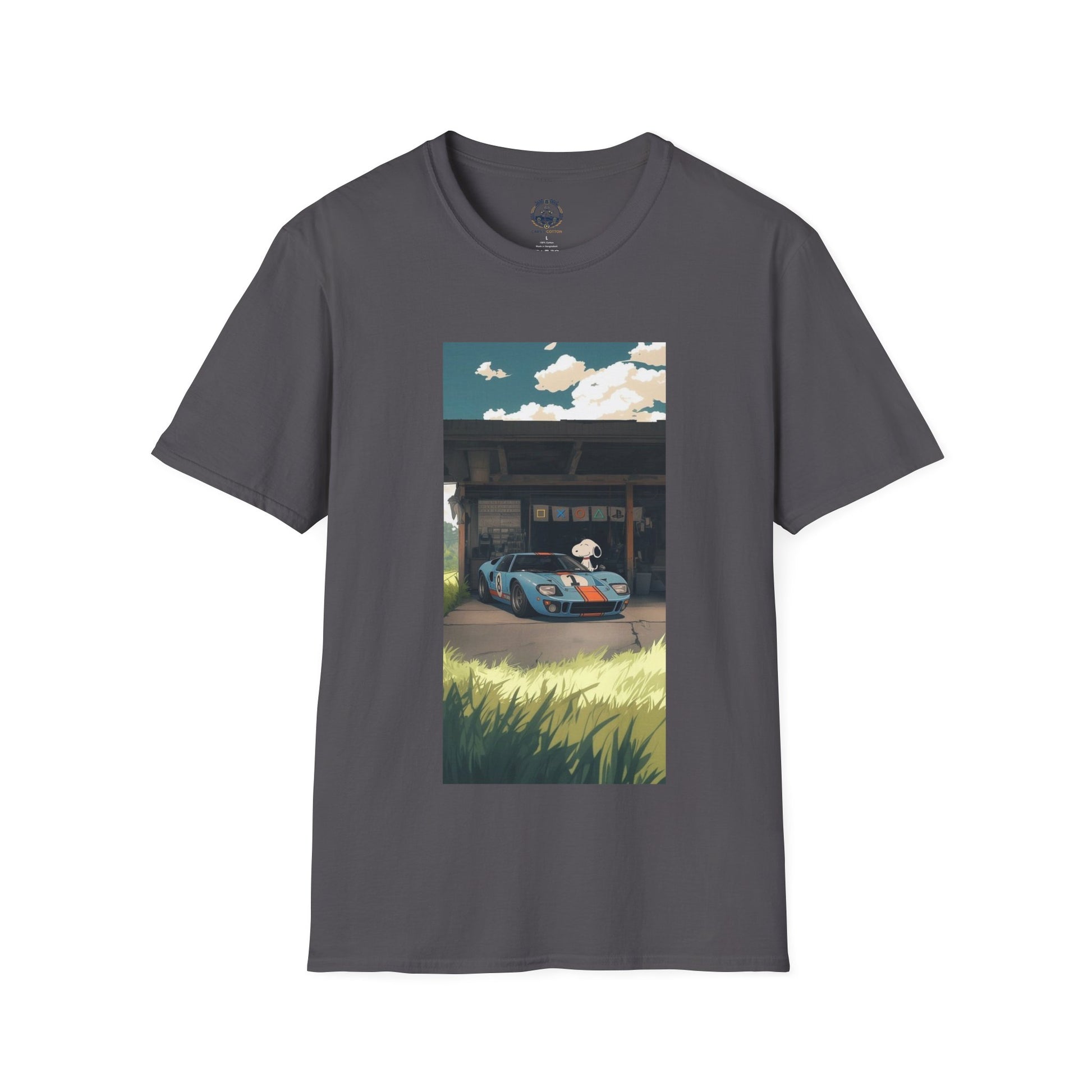 Late afternoon light spills across a quiet garage. A retro sports car rests half-shadowed while tall grass sways at the driveway edge. This shirt carries that slow, cinematic moment—warm sun, lingering humidity, and the small, private calm of someone polishing metal and remembering a road trip. Wear it when you want to hold onto a summer pause, when errands turn into a chance to cruise, or when you simply want a subtle scene that starts conversations without shouting. The soft, smooth cotton feels light against the skin while the framed illustration keeps the look clean and wearable.